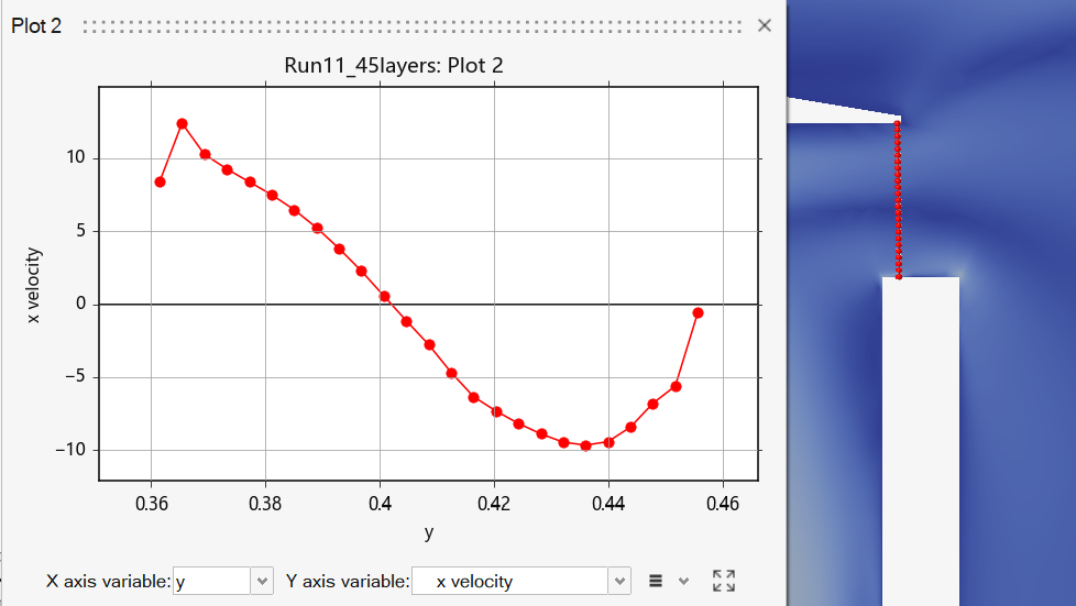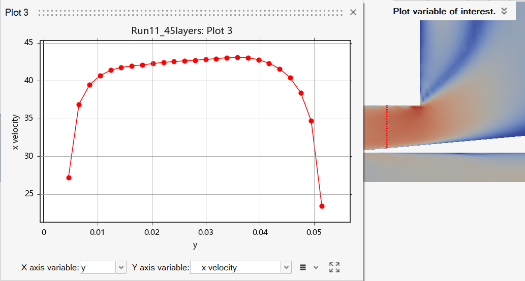 The x direction velocity profile at the inlet of the battery containment was also analyzed for completeness as seen in the figure above Here, the inlet velocity is essentially uniform at about 42-43 m/s, with major reductions near both walls due to the imposed no slip condition on these surfaces.