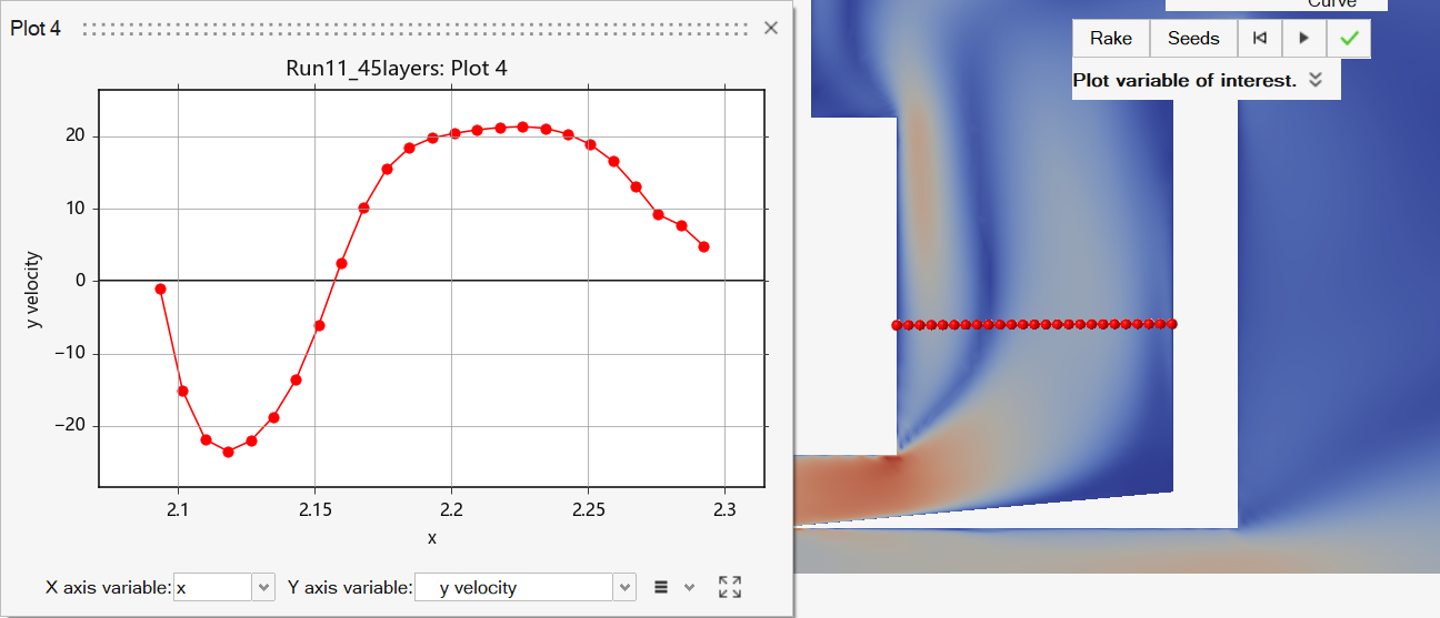Further analysis was done regarding the exit velocity of the area of interest for this simulation as can be seen in the figure above. Here, the velocity profile in the x direction across the entire exit is plotted, with the points shown on the contour plot. From this we can see that most of the air is leaving towards the bottom of this opening with an exit speed of approximately 13 m/s. This velocity decreases as the points move further away from this bottom location, and at the approximate midpoint the flow begins to change direction and enter the battery containment area resulting from the junction of velocity of air over the car and the presence of an eddy, as demonstrated by the streamlines in the figure below.